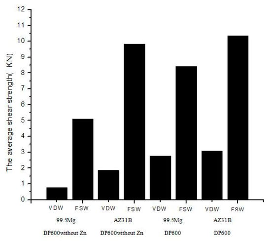 The regular rule of lap shear tensile test results can be concluded from the table above. Distinguished from the welding methods: FSKSW > VDW; distinguished from the material combination: FSKSW AZ31B–DP600 > AZ31B–non-zinc-coated DP600 > Mg99.50–DP600 > Mg99.50–non-zinc-coated DP600. However, VDW AZ31B–DP600 > Mg99.50–DP600 > AZ31B–non-zinc-coated DP600 > Mg99.50–non-zinc-coated DP600. Data is plotted in a histogram and shown in Figure 10.