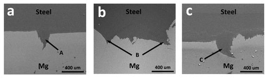 Figure 6 shows transverse cross-section morphology of the combination of four materials. As shown in Figure 6, we can obviously conclude that Mg/steel welding joints had the typical feature of mechanical connection with a serrated bonding interface no matter what types the joints were. It was showed that the base material attained a thermoplastic state under the drastic and fast rotation of the tool and shoulder. Mg/steel components were intermixed together and the bonding interface was changed from the linear shape to the curved shape. As shown in label A and B of Figure 6, the steel components that were stirred into the Mg matrix was similar to the rivet or hook embedded in the Mg and further formed a solid joint.