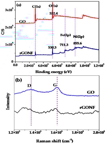 In Figure 1b, the Raman spectra (IFS 66/S, FRA106/S (BRUKER OPTICK GMBH, Ettlingen, Germany)) of rGONF displays two prominent peaks at 1358 and 1606 cm−1, which correspond to the D band and G band, respectively. It is well known that the G band corresponds to the first-order scattering of the E2 g mode observed for sp2 carbon atoms and the D band is associated with the vibrations of sp3 carbon atoms in rGONF. The D and G bands moved to a lower range of Raman shifts at ~1303 and ~1591 cm−1 and is associated with the reduction of GO. The formation of rGONF was further confirmed by the measurement of the structural disorder from the intensity ratio of the D and G bands (ID/IG). The intensity ratio of the D and G bands for rGONF was 1.094, showing an enhanced value compared to that of GO (0.96) []. In addition, the obtained rGONF has considerable crystallinity. This result indicates the presence of localized sp3 defects within the sp2 carbon frame upon the reduction or interaction of GO with NiFe2O4.