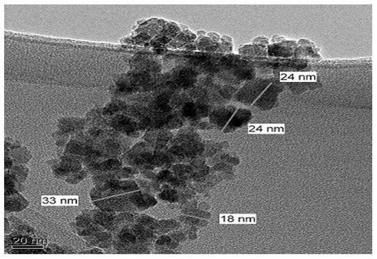 The surface characteristics of rGONF were studied by an Autosorb-1, (Quantachrome instruments, Boynton Beach, FL, USA) using Brunauer-Emmett-Teller (BET) surface analysis with nitrogen (N2) adsorption-desorption isotherms. The BET surface area of rGONF is 167.26 m2·g−1 and the particle size is 34.46 nm. The modifications of GO (surface area: 12.04 m2·g−1) with nickel ferrite (surface area: 80 m2·g−1) increases its surface area to a large size and is favorable for enhancing its adsorption capacity. The resultant average pore volume and pore diameter of rGONF indicates the presence of nano-crystalline meso-porous composite particles. The resultant average particle sizes, 34.46 nm for rGONF, closely agree with the results obtained from the TEM studies (Figure 2) (which is measured by a High-Resolution Transmission Electron Microscope (HR-TEM) (JEM-4010, JEOL, Peabody, MA, USA)). Based on these overall results, the average particle size of rGONF was found to be 32.0 ± 2.0 nm. The surface site density (or) site concentration for the specific surface area (Ns) of rGONF was calculated using potentiometric titration and was found to be 0.00238 mol·g−1, which is higher than that for the GO and NiFe2O4 []. Thus, the high surface area with high surface site density of rGONF can have potentially advantageous for the adsorptive removal of pollutants.