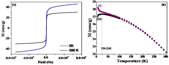 Magnetic measurement of rGONF using a SQUID magnetometer. The trend of magnetization (M) of rGONF with external magnetic field (a) and the temperature at 100 Oe (b).