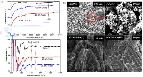 Fourier Transfer-Infrared Resonance (FT-IR) spectra of rGONF (a) and scanning electron microscopy images of rGONF and metal ion loaded rGONF (b). (The dotted lines indicate the functional groups and its comparative shifting of peaks by loading; the high-resolution of red circled in Figure 4b indicates the highly porous nature of rGONF).