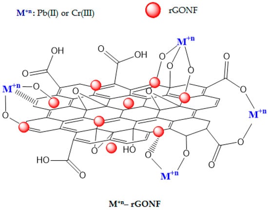 To understand the adsorption mechanism, the Fourier Transfer-Infrared Resonance (FT-IR) spectrum (Figure 4a) of rGONF loaded with heavy metal ions was studied. Shifting of the absorption peaks of the –C–O, –C–C=C–, and –OH functional groups and Fe–O (520 to 560 cm−1) bond stretching vibration peaks of rGONF to a lower wave number by loading Pb(II) and Cr(III) was observed. However, the –C–C=C– functional groups and Fe–O of rGONF were effectively shifted more than that of –C–O and –OH. This shifting may be related with the adsorption of Pb(II) and Cr(III) onto rGONF by the chemical interaction between the metal ions and rGONF surface functional groups such as –C–O, –C–C=C–, and –OH, along with oxygen in the Fe–O bond of ferrite. However, the π-electrons of –C–C=C– of graphene oxide along with oxygen in the Fe–O bond of ferrite have a major role for the adsorption of Pb(II) and Cr(III) rather than that of –C–O and –OH functional groups of rGONF. The SEM-surface morphology (Figure 4b) of metal ion loaded rGONF was different compared to that of bare rGONF, supporting the Pb(II) and Cr(III) adsorption onto rGONF. The overall obtained results described the chemical interactions or complexed surface interactions between the homogeneous surface functional groups of rGONF and the metal ions causing chemisorption. A schematic representation of the possible adsorption mechanism has been shown in Figure 5.