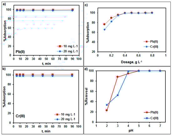 Figure 6a,b shows that the removal of Pb(II) and Cr(III) with rGONF was rapid and immediately (within 5 min) reached 99% maximum adsorptive removal of Pb(II) and Cr(III). As the contact time further increased to 90 min, the adsorption percentage becomes constant. Therefore, the contact time can be optimized to 30 min for both Pb(II) and Cr(III) with rGONF, respectively.