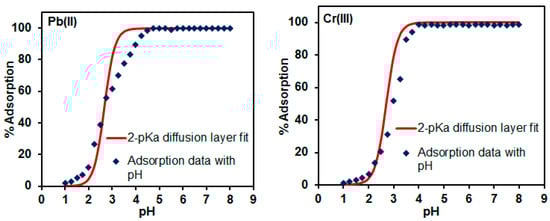The effects of solution pH on the adsorption of Pb(II) and Cr(III) onto rGONF were studied by varying the aqueous solution pH (Figure 6d). The adsorption of Pb(II) rapidly increased from pH 2.0 to 3.0, then slowly increased and reached maximum adsorption percentage at pH 4.0 to 5.0 for Pb(II). While the adsorption of Cr(III) was not rapidly increased from pH 2.0 to 3.0, then slowly increased and reached maximum adsorption percentage at pH 4.0 for Cr(III). At lower pH, the high H+ concentration was competitive with both metal ions that caused low adsorption. As the solution pH increased, the adsorption of metal ions on the rGONF increased due to the decreasing H+ ion concentration which acted as a competitor to the positive metal ions for adsorption sites on the surface of the nanocomposites. However, the high adsorption of both metal ions onto rGONF at pH < pH of zero-point charge (pHzpc) (6.20) (The pHzpc and acid-base property of nanocomposite was measured by the acid-base titration method as well as the initial and final pH measurement in aqueous solutions (Figure S1). The calculation details were reported at footnote of Figure S1) of rGONF and independent of ionic strength indicates that the adsorption process was not an electrostatic interaction and may be the inner-sphere chemical interaction. The inner-sphere chemical complexation of the adsorption of metal ions was proven from the 2-pKa-diffusion model (illustrated by the Visual Minteq-3.0 program) (Figure 7), where the experimental adsorption data was in close agreement with the model fitting. Above pH 6.0, the surface charges of rGONF became more negative and may cause increased adsorption of metal ions. However, adsorption experiments were not studied above pH 6.0 where the metal ions can precipitate as their hydroxide complexes in aqueous solutions []. Therefore, further adsorption studies of both metal ions, Pb(II) and Cr(III), were studied at pH 5.0 and pH 4.0, respectively.