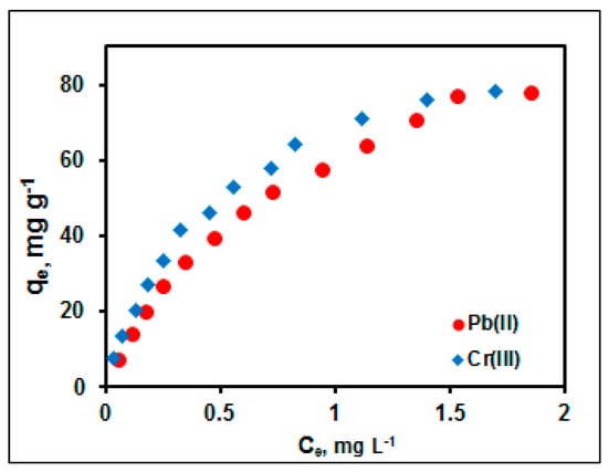 Isotherm parameters of Pb(II) and Cr(III) (Co = 2.0 to 25 mg·L−1) adsorption onto rGONF at 0.4 g·L−1 dosage and 298 ± 2 K for 30 min (n = 3, mean ± SD).