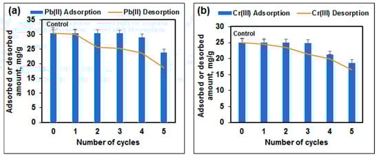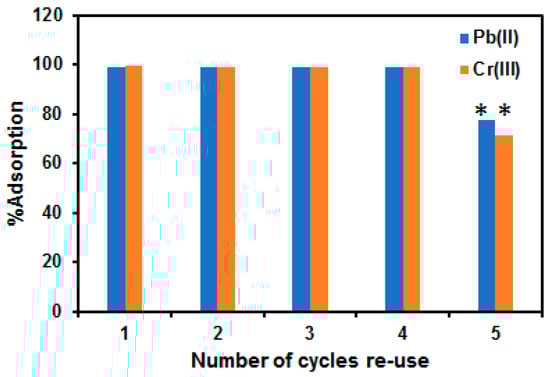 We also conducted batch adsorption and desorption experiments for the spiked real ground water sample with the developed procedure for the evaluation of the real field applicability or real field re-usability of the adsorbent and the obtained results are shown in Figure 10. The obtained results showed that the developed method can be re-used up to four cycles with more than 99% adsorption of both metal ions. However, the desorption capacity decreased with increasing the re-use cycles.