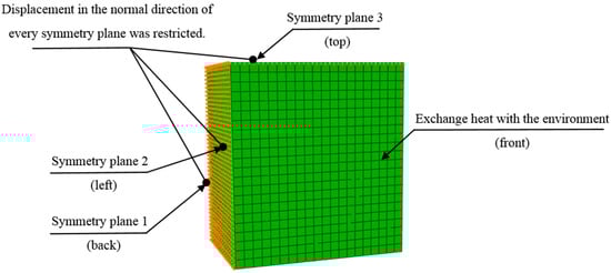 The numerical simulation software ABAQUS standard with coupled temperature–displacement analysis was used to further study the influence of material properties and cooling rates at different temperatures on plastic strain and residual stress during quenching. The size of the model was the same as that of the samples used for the heat treatment experiments. Only the two end surfaces (110 mm × 100 mm) exchanged heat with water during quenching. Due to the symmetry, only an eighth of the sample was used to reduce calculating time, as shown in Figure 4. The displacement in the normal direction of the three symmetry planes was restricted. Similar to the experiments, only end surface of this model exchanged heat with the environment. The element type used in this model is an 8-node thermally coupled brick, trilinear displacement and temperature element (C3D8T), and the number of the elements was 6160. The incremental time in the analysis is chosen automatically by the computer program and the solution technique is full Newton method.
