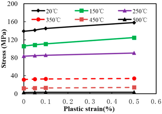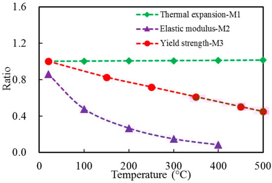 Multiplier factors of thermal expansion coefficient, elastic modulus, and yield strength at different temperatures.