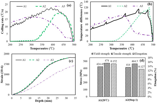 Figure 9 shows the cooling rates at P0, temperature differences between points P0 and P1, strains measured by the slitting method, and tensile properties of the samples. The results show that reducing the cooling rates in a low temperature range does not reduce residual stresses. However, an optimized step quenching process can minimize the residual stresses and result in good mechanical properties. As shown in Figure 9a,b, the cooling rates and temperature differences between P0 and P1 of Samples A1 and A2 are almost the same in the temperature range from 500 to 420 °C, and the cooling rates and temperature differences of Sample A2 are much lower than those of Sample A1 at temperatures below 400 °C. However, the residual stresses of the two samples are almost the same, as shown in Figure 9c. This means that changing the cooling rates at low temperatures does not change the residual stresses for the Samples A1 and A2. In the case of Sample A3, the cooling rates are lower at temperatures above 300 °C, especially above 450 °C, than those of Sample A1. The cooling rates are higher than those of the sample A1 at temperatures below about 300 °C. The temperature differences of Sample A3 are lower at temperatures above 400 °C and slightly higher at temperatures below 350 °C. However, the residual stresses of Sample A3 are much lower than those of Sample A1 due to the lower cooling rates at high temperatures. This is because plastic strain occurred more easily at high temperatures, according to the results and analysis presented in Section 3.1. Moreover, as shown in Figure 9d, the tensile properties of sample A3 are close to those of Sample A1, because the cooling rates are high in the quenching sensitivity range from 300 to 400 °C [15]. This means that residual stresses and mechanical performances can be balanced by employing an optimized quenching technology with low cooling rates in high temperature range and high cooling rates in other temperature ranges.