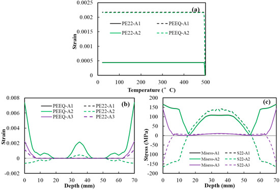 The numerical simulation method was used to further study the influence of cooling rates on the evolution of residual stress. Figure 10 shows the evolution of the plastic strain at P0, plastic strains and residual stresses along L0. As shown in Figure 10a, the plastic strains (plastic strains in the y direction (PE22) and equivalent plastic strain (PEEQ)) at P0 of Sample A1 and A2 vs. temperature curves are almost the same. The plastic strains reached the magnitudes at about 490 °C and remained unchanged thereafter; even the cooling rates of Sample A2 are much lower below 400 °C. According to the results and analysis presented in Section 3.1, to produce a certain plastic strain, the temperature difference should be increased with decreasing temperatures. This explains that reducing the cooling rates at low temperature range does not reduce the plastic strains at P0. Consequently, as shown in Figure 10b,c, the plastic strains (PE22 and PEEQ) and residual stress (Mises stress and principal stresses in the y direction (S22)) along L0 of the two samples are almost the same. Moreover, in the case of Sample A3, the step quenching technology produces lower plastic strains and residual stresses along L0 due to the low cooling rates at high temperatures. The results coincide with the experimental results in the above paragraph.