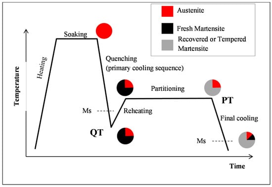 Typical time–temperature scheme to produce Quenching & Partitioning (Q&P) Transformation Induced Plasticity (TRIP) steels after a full austenitic soaking, and corresponding microstructures, according to [,,]. The quench temperature (QT) and the partitioning temperature (PT) characterizing the cycle are positioned on the cycle.