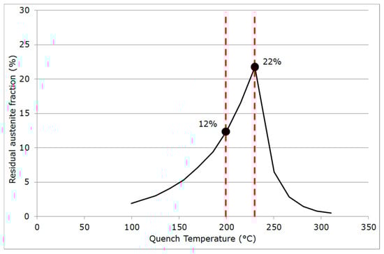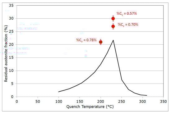 As already highlighted by HajyAkbari et al. [] and Thomas et al. [], carbon content remaining trapped in the bcc phases (martensite and bainite) was far from being negligible, which jeopardized the possibility of verifying strictly the original Speer’s assumption (almost carbon-free bcc phases). The measured phase fractions are plotted in Figure 6 as functions of the QT and are compared to the calculations of Figure 2. The experimental data were higher than values expected by the model. Nevertheless, the effect of the QT seemed well captured: a lower QT led to a lower fraction of more stable austenite.