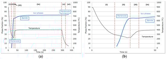 Figure 3a shows the evolution of the temperature and measured phase fractions as a function of time for the reference cycle: QT = 230 °C/PT = 400 °C. The figure is restricted to the most interesting part of the cycle, i.e., austenite decomposition after soaking. The evolution can be decomposed into six steps, which have been described in [], and are separated in Figure 3 by red dashed lines (for clarity, the first 50 s have been detailed in Figure 3b):