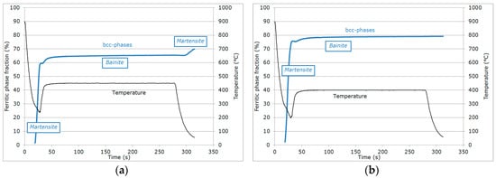 - Reheating step, with a duration of a few seconds, because of the regulation procedures of the heating device: The duration of this transient regime was lower than 5 s, before temperature stabilization for the partitioning step. Figure 3b reveals that during the reheating step, the phase fractions remained constant. For all studied conditions, the phase fractions remained constant during reheating up to about 370 °C.