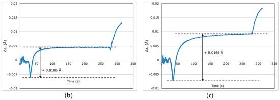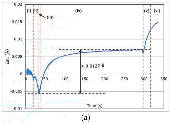 Similar behaviors were observed at a higher PT or lower QT; only experimental thermal expansion coefficients were reassessed for each experiment (2.575 × 10−5 K−1 for PT = 450 °C; 2.673 × 10−5 K−1 for QT = 200 °C). The respective evolutions of Δaγ are represented in Figure 5b,c. For the sake of comparison, Table 1 summarizes the full variations in Δaγ during steps (ii), (iv) and (vi) for the three tested conditions.