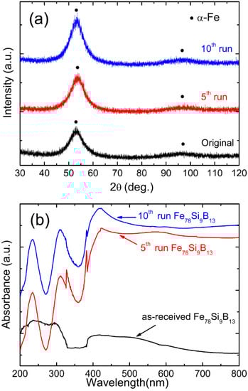 (a) X-ray diffraction (XRD) patterns, (b) ultraviolet visible diffuse reflectance spectrum (UV–vis DRS) of as-received, fifth and tenth run reused Fe78Si9B13 ribbons.