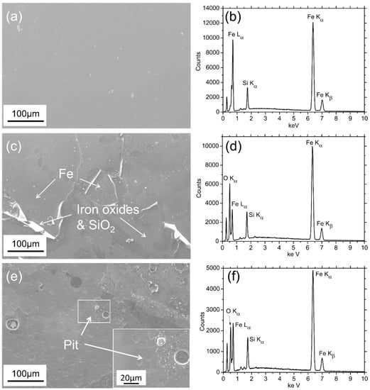 Scanning electron microscope (SEM) micrograph of (a) as-received, (c) fifth run reused and (e) tenth run reused Fe78Si9B13 ribbons; corresponding energy-dispersive spectroscopy (EDS) results of (b) as-received, (d) fifth run reused and (f) tenth run reused Fe78Si9B13 ribbons.