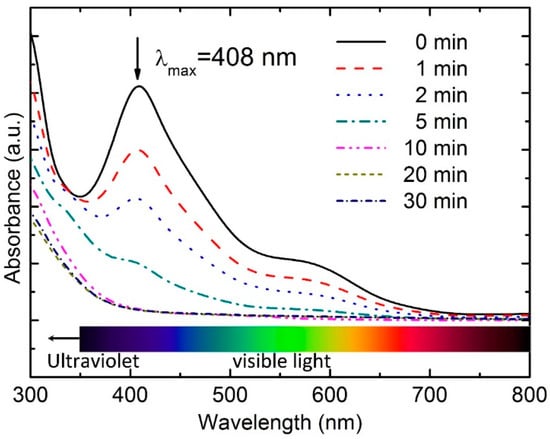 For the dye degradation experiments, 1000 ppm NGB dye solution was firstly prepared and stored in a 500 mL flask for preservation. Then the specific volume of NGB dye solution of 1000 ppm was extracted by a macropipette (SocorexIsba S.A., Ecublens, Switzerland) and diluted to a required dye concentration (10 ppm, 20 ppm, 50 ppm, and 100 ppm). During all the experiments, ribbons with a specific weight (0.03 g, 0.05 g, 0.1 g, and 0.2 g) were immersed into a 100 mL NGB solution under continuous mechanical stirring by Vortex-Genie 2 mixer (Scientific Industries, Inc., New York, NY, USA). The irradiation was provided by a 300 W Xeon simulated solar light lamp (Perfectlight Scientific Pty Ltd., Beijing, China). The pH value of dye solution throughout this work was about 5.8, measured by an Oakton pH/conductivity meter (PC 2700, Cole-Parmer, Vernon Hills, IL, USA). Approximate 3.5 mL NGB dye sample was taken from the beaker at the predetermined time intervals (i.e., 1, 2, 4, 6, 8, 10, 12, 15, 20, and 30 min), then injected into a 3.5 mL quartz cuvette with a pathlength 10 mm, following scanning in turn using a Perkin Elmer Lambda 35 UV–vis spectrometer (Shelton, CT, USA). The wavelength of light absorbance λmax of NGB was measured at the 408 nm. After the addition of PMS, the peak shifts from 714 to 408 nm due to the acidic nature of PMS. Dye degradation efficiency was calculated by Equation (1):