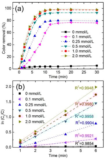 (a) Effect of PMS concentration on color removals in percentage vs. time; (b) variation of ln(C0/C) vs. time at different PMS concentrations (Fe78Si9B13 dosage: 0.5 g/L; dye concentration: 50 ppm; irradiation intensity: 7.7 μW/cm2).