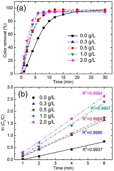 (a) Effect of Fe78Si9B13 dosage on color removals in percentage vs. time; (b) variation of ln(C0/C) vs. time at different Fe78Si9B13 dosage (PMS concentration: 1.0 mmol/L; irradiation intensity: 7.7 μW/cm2; dye concentration: 50 ppm).
