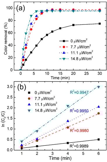 Color removal and reaction kinetics of various irradiation intensities.