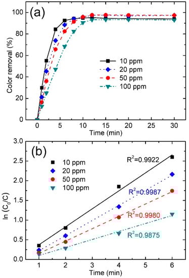 (a) Effect of dye concentration on color removals in percentage vs. time; (b) variation of ln(C0/C) vs. time at different dye concentration (PMS concentration: 1.0 mmol/L; Fe78Si9B13 dosage: 0.5 g/L; irradiation intensity: 7.7 μW/cm2).
