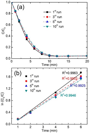 In order to study the surface stability and catalytic reusability of Fe78Si9B13 ribbons, the same ribbons are reused 10 times. All the recycling experiments in this work are carried out on the same conditions (PMS concentration: 1.0 mmol/L; Fe78Si9B13 dosage: 0.5 g/L; irradiation intensity: 7.7 μW/cm2; dye concentration: 50 ppm). Figure 8 shows the results of first, third, fifth, and tenth run of dye degradation with Fe78Si9B13 ribbons. The corresponding data of the first-order kinetic model are summarized in Table 7. It can be seen that the NGB degradation rate is about 92% within 8 min for the first run and only very slightly decreases during third, fifth, and tenth run. Comparing the color removal rate and the reaction kinetics (k) of the first run with the tenth run, the color removal rate slight drops from 92.1% to 89.4% at 8 min and the reaction rate k decreases from 0.2997 to 0.2571 min−1. It is can be postulated that the product on the catalytic ribbons surface during the NGB degradation, as seen from Figure 2, which are crystallized α-Fe, iron oxides and SiO2, slightly decease the Fe78Si9B13 catalytic efficiency []. Although, the weak bonding films form firstly during the dye degradation, with the help of vortex-stirrer, it is easy to fall off from the catalytic ribbon surface, which make it possible to continuously provide sufficient iron source for activating PMS. It is easy to find that there is no obvious difference between the results of fifth and tenth run. It reveals that Fe78Si9B13 has excellent reusability in NGB degradation and can be run at least 10 times.