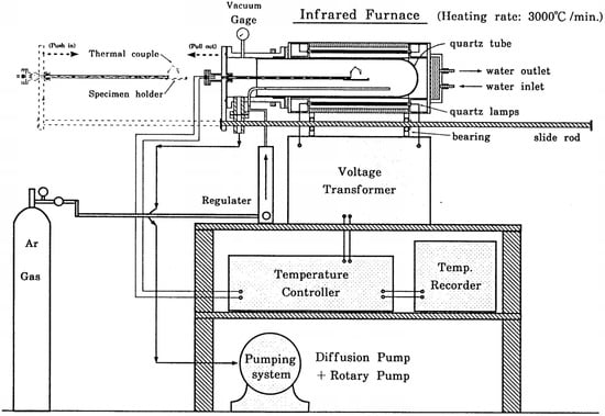 In the experiment, infrared heating was used to braze Ti50Ni50 SMA and 316L SS using a Cu barrier layer in between Cusil-ABA (active braze alloy) and BAg-8 filler metals, as shown in Figure 1. An infrared heating furnace made from ULVAC Company (Tokyo, Japan) with the model of RHL-P816C was utilized as the main component. The furnace was kept at 5 × 10−5 mbar vacuum and set at 15 °C/s heating rate in the test. Figure 2 shows the schematic diagram of infrared brazing furnace. Graphite holders on both substrates were used to increase the infrared ray absorption on the specimen. The dissimilar brazed sample was preheated at 700 °C for 300 s before infrared brazing in order to equilibrate thermal gradient of the brazed sample. 820 °C and 850 °C for 300 s were selected as the brazing condition.