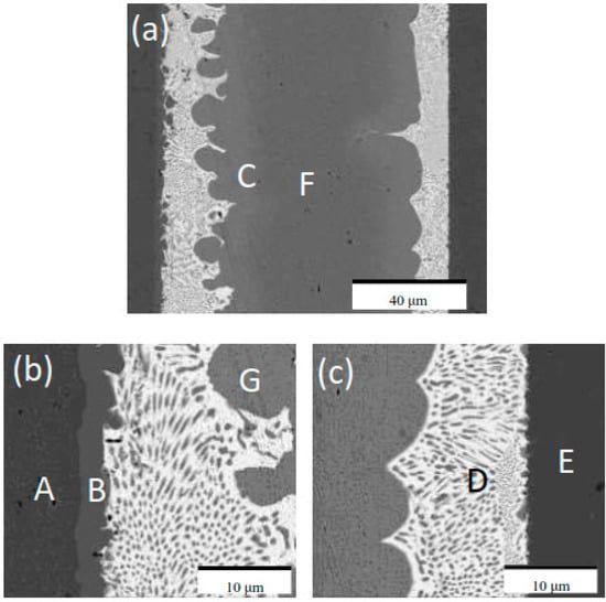 Figure 3 and Table 2 show the cross-sectional results of SEM backscattered election images (BEIs) and energy dispersive spectroscope (EDS) chemical analysis results of Ti50Ni50/Cusil-ABA/70 μm Cu foil/BAg-8/316L SS specimens brazed by infrared rays at 820 °C for 300 s. In EDS analyses, the electron beam in a point with 1 μm in diameter was used for all single phase analysis, and a larger beam diameter of 5 μm was applied for eutectic analysis as marked by D in Figure 3. Figure 3a illustrates the cross-sectional SEM BEIs results, in which the area on the Ti50Ni50 side and that on the 316L SS side are displayed in Figure 3b,c, respectively. From Figure 3a, the thickness of the Cu interlayer is about 70 μm (labelled by C and F). The layer marked by C in the left side of the Cu interlayer contains 90.5 at % Cu and has some Cu atoms dissolved into Cusil-ABA melt to form the proeutectic Cu (labelled by G in Figure 3b). Figure 3b indicates that a layer of (CuxNi1−x)2Ti intermetallic (labelled by B) is formed at the interface of Cusil-ABA filler and Ti50Ni50 base metal. It is similar to the Ti50Ni50 side of 316L SS/Cusil-ABA/Ti50Ni50 joint brazed by infrared rays at 870 °C and 900 °C for 300 s []. In contrast, there is no interaction layer formed in between the BAg-8 braze and the 316L SS substrate, as displayed in Figure 3c. The Cu interlayer is dissolved into both molten brazes resulting in irregular interfaces among Cu and two brazes.