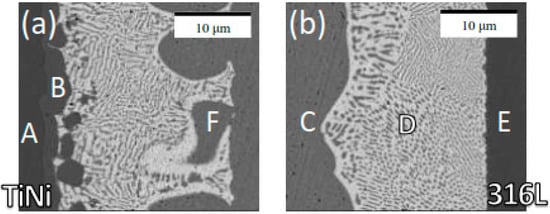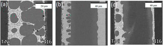 Equal atomic TiNi shape memory alloy (SMA) is one of the best and intensively studied SMAs with excellent shape memory properties [,]. At present, equiatomic TiNi SMA has many industrial applications, such as mechanical actuators and micro sensors in intelligent material systems [,]. AISI (American Iron and Steel Institute) 316L stainless steel (316L SS) has the chemical composition in wt % of Fe-0.03C-17Cr-12Ni-2.5Mo and exhibits high oxidation and corrosion resistance []. Joining of Ti50Ni50 SMA and 316L SS has the opportunity for industrial applications. For instance, shape-memory actuators are used to replace exploding bolts utilized in petrochemical equipment and nuclear power plants []. The shape-memory actuator is joined with an infrastructure made of stainless steel or nickel-based alloy. In our reported study, dissimilar joining of Ti50Ni50 SMA and 316L SS by infrared brazing using two Ag-based filler metals, Ticusil (Ag-26.7Cu-4.5Ti, wt %) and Cusil-ABA (Ag-35.25Cu-1.75Ti, wt %), was evaluated []. Test results demonstrated that the maximum joining strength of 237 MPa shear stress can be obtained for Ticusil filler brazed at 950 °C for 60 s, and 66 MPa for Cusil-ABA one joined at 870 °C for 300 s. The formation of Ti-Fe-(Cr) interfacial layer was found to be detrimental to all joint strengths [].