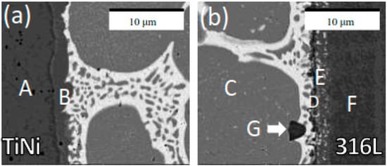 Figure 5 and Table 3 illustrate the cross-sectional results of SEM BEIs and EDS chemical analyses of Ti50Ni50/Cusil-ABA/25 μm Cu foil/BAg-8/316L SS specimen brazed by infrared rays at 850 °C for 300 s. Figure 5a,b indicate the area on the Ti50Ni50 side and that on 316L SS side, respectively. In Figure 5a, a (CuxNi1−x)2Ti intermetallic layer (labelled by B) is formed at the Ti50Ni50 side which is similar to that in Figure 3b [,,]. The silver penetrated into the (CuxNi1−x)2Ti layer is also observed. According to Figure 5b, two interfacial layers are formed at the 316L SS side, one is Ti(Fe, Ni) intermetallic layer (labelled by D), and the other is regarded as a layer of (Fe, Cr)-rich phase (labelled by E) []. The existence of continuous Ti(Fe, Ni) reaction layer will be discussed later. Both D and E layers have silver agglomerations (white spots in Figure 5b) with the layer E having more. In addition, there is a TiCu precipitate in the braze, as labelled by G in Figure 5b []. The existence of the Ti-Fe interfacial layer in Figure 5b is quite dissimilar to that in Figure 3c. Because the 25 μm Cu barrier layer is completely dissolved into the braze melt, Ti atoms transport into the 316L SS side forming the interfacial Ti(Fe, Ni) intermetallic layer [].