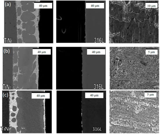 SEM BEI cross sections of Ti50Ni50/Cusil-ABA/Cu/BAg-8/316L SS specimens infrared brazed at 850 °C for 300 s with the Cu interlayer of (a) 25 μm; (b) 50 μm; (c) 70 μm. (TiNi: Ti50Ni50 substrate, 316: 316L SS substrate).