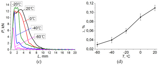 The relaxation capacity of the material with the decreasing test temperature at the macroscopic level can be quantitatively defined using the maximum contraction ratio of the specimen λ (%) in the crack growth region (see Table 1). The maximum contraction ratio is the ratio of the reduced cross-sectional area of the fractured specimen to the initial cross-sectional area, expressed as a percentage [20,21]. According to the literature, the decrease in the work of plastic deformation in specimen fracture directly depends on the change in the mobility of dislocations. The activation of plastic deformation with the test temperature increase from T = −60 to 20 °C at the crack tip and contraction λ (%) (see Table 1) must also contribute to the elimination of other microdefects that reduce the mobility of dislocations (dislocation barriers, dispersed second phase particles, etc.), thus leading to an increase in the impact toughness.