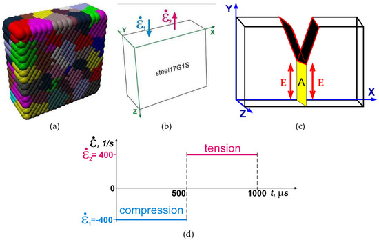We analyzed the behavior of a prismatic specimen (having a representative mesoscopic volume) with the grain structure typical of 17Mn1Si steel. Each specimen has 30 μm × 10 μm × 30 μm dimensions and is represented as a cellular automaton with an fcc packing of elements of 1 μm each; the grain size is set at 5 μm (Figure 3a). The simulation time step is 10 ns. The initial stress and strain are zero. The upper face is compressed at a rate of 400 s−1 during the first 500 μs and then extended at the same rate during the next 500 μs (Figure 3b,d). There is no energy exchange through other boundaries.