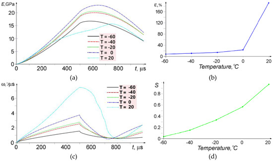 Specific elastic energy of specimens vs. time (a); total strain vs. test temperature (500 µm) (b); average angular velocity of microrotations vs. time (c); and fraction of microrotation energy in the total elastic energy supplied vs. test temperature (500 µm) (d). The legends show the temperatures T in °C.