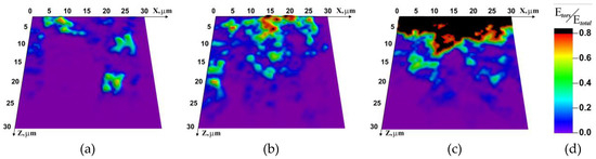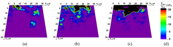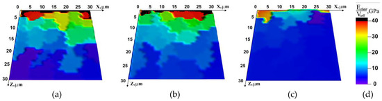 Figure 7 shows the distribution of the relative rotation energy. The distribution remains almost unchanged with time at the lowest test temperature (T = −60 °C), even despite the change in the direction of applied external load. As relaxation becomes more probable with the growing temperature (T = −20 °C), the size of the region involved in inelastic deformation increases, including the distribution in Z direction (Figure 7b). At room temperature (Figure 7c), inelastic deformation revealed from the rotation energy distribution is mostly localized in the upper layer, again apparently due to the activation of dissipation at the boundaries of structural elements (grains).