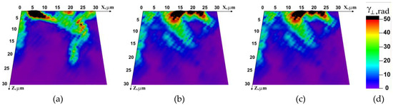 The discussed effect can also be demonstrated by the distribution patterns of accumulated strain in the direction perpendicular to the fracture surface as a result of microrotations. Figure 8 shows the distribution of ( is the accumulated angle of local material rotation) on the specimen faces at different temperatures at 500 μs after the start of loading. The quantity is responsible for the formation of the deformation relief in the XOZ coordinate plane, i.e., on the future fracture surface. At lower test temperatures, the accumulated rotation value is much lower and reaches limiting values in individual crystallites only (Figure 8a,b).
