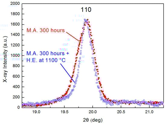 The {110} XRD peak profiles of the powder before and after hot extrusion.