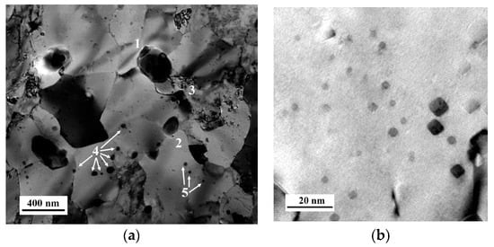 TEM micrographs showing precipitates observed from ODS steel after HE: (a) Type 1 precipitates (points 1–5) and (b) nanometric squared Type 2 precipitates.