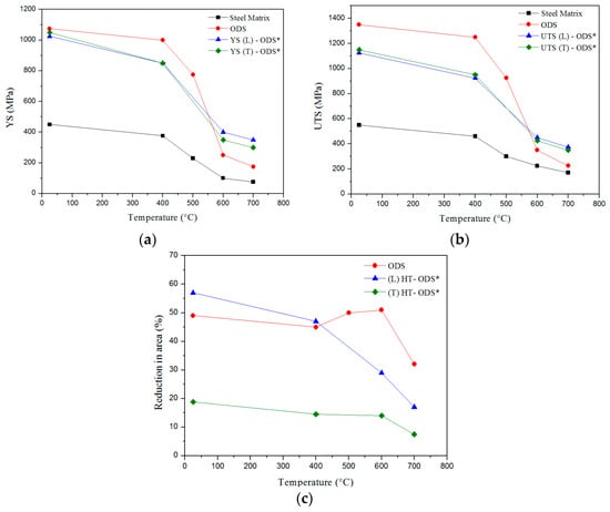 The tensile behavior at increasing test temperature of the examined ODS steel is compared with that of unreinforced steel (steel matrix) and of ODS*, a material prepared through the conventional route (high-energy MA/HE at 1100 °C/heat treatment of 1.5 h at 1050 °C) []: (a) Ultimate Tensile Stress (UTS); (b) Yield Stress (YS); and (c) Area reduction. Data adapted from [] refer to samples taken along longitudinal (L) and transverse (T) directions.