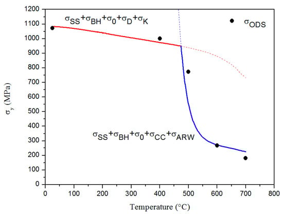 Figure 8 compares the sum of all the strengthening contributions and the experimental yield stress of ODS. In fact, from room temperature up to ~500 °C the yield stress is due to the solid solution (σSS), dislocations (σBH), Hall-Petch (σ0 + σD), and Orowan (σK) contributions. In the temperature range 500–600 °C, the component σD undergoes a progressive breakdown confirming the trend reported previously in literature []. In addition, the Orowan stress (σK) losses its efficiency above 500 °C [], so from this temperature the term σK is substituted by σARW.