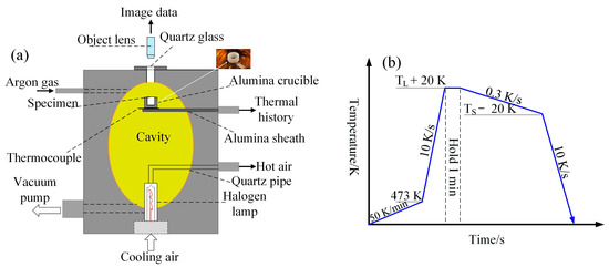 The main composition of peritectic steel Q345 is [C] = 0.15, [Si] = 0.27, [Mn] = 1.38, [P] = 0.02, and [S] = 0.009 (in wt %). A high-temperature, laser-scanning confocal microscope (LSCM, VL2000DX, Yonekura MFG Co. Ltd, Osaka, Japan) was used to observe the solidification path and phase transition of peritectic steel in-situ. The schematic diagram of LSCM is shown in Figure 1a. The samples used are machined to a height of 3 mm and a diameter of 7.5 mm. The thermal scheme is shown in Figure 1b. To clearly observe phase transition in the mushy zone, a relatively low cooling rate of 0.3 K/s was adopted within the temperature range from TL + 20 K to TS − 20 K. TL and TS are the liquidus and solidus of peritectic steels Q345, respectively.