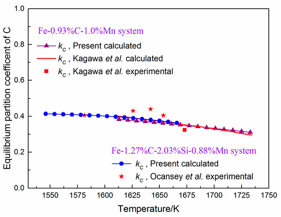 To verify the accuracy of the present model, the equilibrium partition coefficients of C in the Fe-0.93%C-1%Mn ternary system and the Fe-1.27%C-2.03%Si-0.88%Mn quaternary system were calculated, and the results were compared with that from References [12,13]. As shown in Figure 2, the calculation results of the present model for the ternary Fe-0.93%C-1%Mn system are in accordance with the calculation results from Reference [13]. The predicted average in the entire mushy zone is 0.350, which is extremely close to the value of 0.352 from Reference [13]. The deviation between our prediction and the literature result reaches as low as 0.57%. For the quaternary Fe-1.27%C-2.03%Si-0.88%Mn system, from the present model exhibits the same tendency as the experimental data presented in Reference [12]. The average calculated from our model is 0.396, whereas the experimental value is 0.421, which presents a small negative deviation (i.e., 5.94%). Evidently, the results from the present model demonstrate relatively high reliability with respect to reference data. Thus, the model was used for the subsequent thermodynamic calculations.