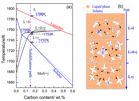 The Fe-C-0.27%Si-1.38%Mn-0.02%P-0.009%S phase diagram of steel Q345 was calculated and shown in Figure 3a. The diagram illustrates that L + δ, L + δ + γ, and L + γ phases coexist in sequence in the solidification path of steel Q345. From 1786 K to 1755 K, L gradually transforms into the δ phase while the L and δ phases coexist. L is residual after the precipitation of δ. A peritectic reaction occurs from 1755 K to 1753 K. The residual L and δ transform to γ until δ is exhausted. L, δ, and γ coexist within this temperature range. From 1753 K to 1737 K, γ will directly precipitate from the residual L while L and γ coexist. When temperature decreases to 1737 K, steel Q345 solidifies completely. An MnS inclusion is not formed in the mushy zone during the solidification of steel Q345 due to the low concentration of Mn and S; this finding is consistent with the report by Bao [20]. Therefore, the effect of MnS precipitation on the equilibrium partition coefficients of Mn and S should no longer be considered. In addition, the redistribution of solutes during the solidification process is illustrated in Figure 3b. This figure indicates that the solutes are rejected from the solid phase to the liquid phase (as the black arrows shown) during solidification, thereby enriching the liquid phase. Firstly, solutes are redistributed between δ and L in the L + δ coexistence zone. Secondly, solutes are redistributed among δ, γ, and L in the L + δ + γ coexistence zone with the formation of γ. As temperature decreases, the δ phase disappears and solutes are redistributed between γ and L in the L + γ coexistence zone. Thus, the equilibrium partition coefficients should be determined quantitatively according to the phase constitution of the mushy zone during solidification.