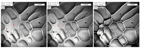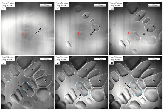The in-situ observations of the phase transition in the mushy zone of steel Q345 are shown in Figure 4, which indicates that the phase transition undergoes three stages. Firstly, L transforms into δ and the grains grow with decreasing temperature, as shown in Figure 4a–c. Secondly, the peritectic reaction occurs, i.e., L and δ transform into γ. L is residual after the peritectic reaction. This process is shown in Figure 4d–f. Third, residual L gradually transforms into γ until complete solidification is achieved, as shown in Figure 4g–i. The in-situ observations of phase transitions confirm the accuracy of the thermodynamic calculations for the solidification path of peritectic steel Q345.