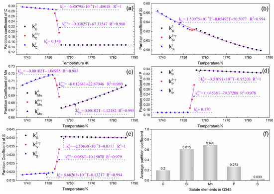The evolution of the equilibrium partition coefficients of Si, Mn, P, and S during the solidification of steel Q345 are shown in Figure 5b–e, respectively. increases with decreasing temperature. From the L + δ zone to the L + δ + γ zone, decreases marginally because is slightly lower than [2]. The effect of the peritectic reaction on the equilibrium partition coefficient of Si is negligible. increases with decreasing temperature. When temperature decreases from 1786 K to 1737 K, increases from 0.579 to 0.667, i.e., an increase of 15.2%. Thus, the effect of temperature on the equilibrium partition coefficient of Si is not ignorable.