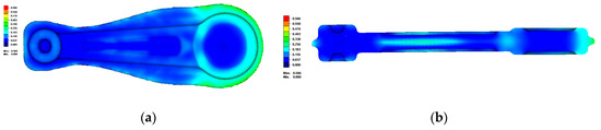 AA5754 and AA5083 aluminium alloys were selected both with a Young modulus of 70 GPa and a Poisson coefficient equal to 0.3. As can be observed in Figure 7, the load applied at the top of the connecting rod is equal to 1 kN. Figure 8 shows the Von Mises stress when this load of 1 kN was applied.