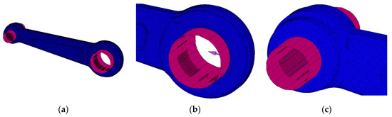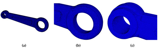 (a) Meshing of the connecting rod; (b) and (c) detail of the meshing at the top and at the bottom of the connecting rod.
