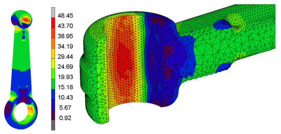 As can be observed, the maximum value of the equivalent Von Mises stress is achieved at the bottom of the connecting rod, specifically in the inner surface which is in contact with the pin joint. Equation (2) shows the stress tensor in this zone as a function of the applied tension load.